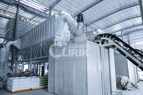 破碎后的小塊膨潤土經(jīng)提升機(jī)送至料倉,再經(jīng)振動給料機(jī)將其均勻定量的送入磨粉機(jī)研磨室內(nèi)進(jìn)行研磨。